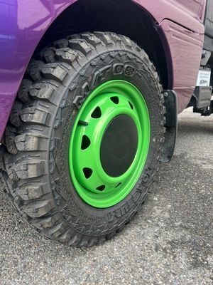 Professionally Wrapped, 13" Powder Coated Steel Wheels and Tire Package, Bed Liner frame and entire bed, inside and out.